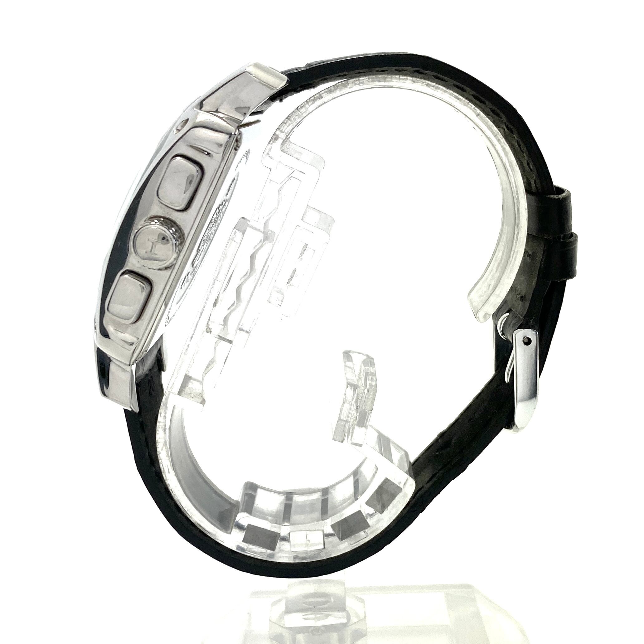 ブラックダイヤルにクロノグラフ機能とデイト表示を備え、デザイン性だけでなく実用性も兼ね備えた一本。ムーブメントにはクォーツを採用し、高い精度と扱いやすさを実現しています。
