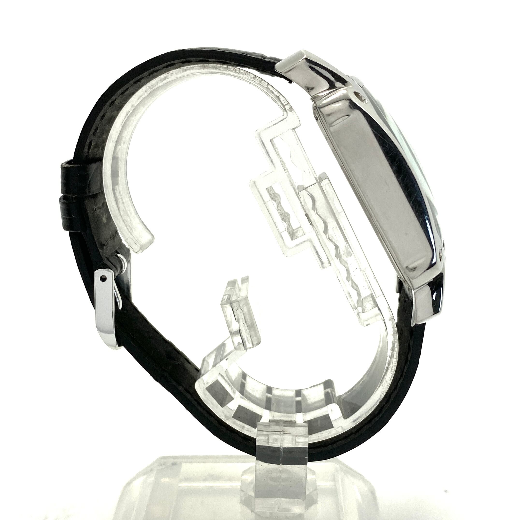 レクタンギュラーケースに独特のカーブを持たせたフォルムと、幾何学的なダイヤルデザインが特徴で、一般的なラウンドウォッチとは一線を画す存在感を放ちます。