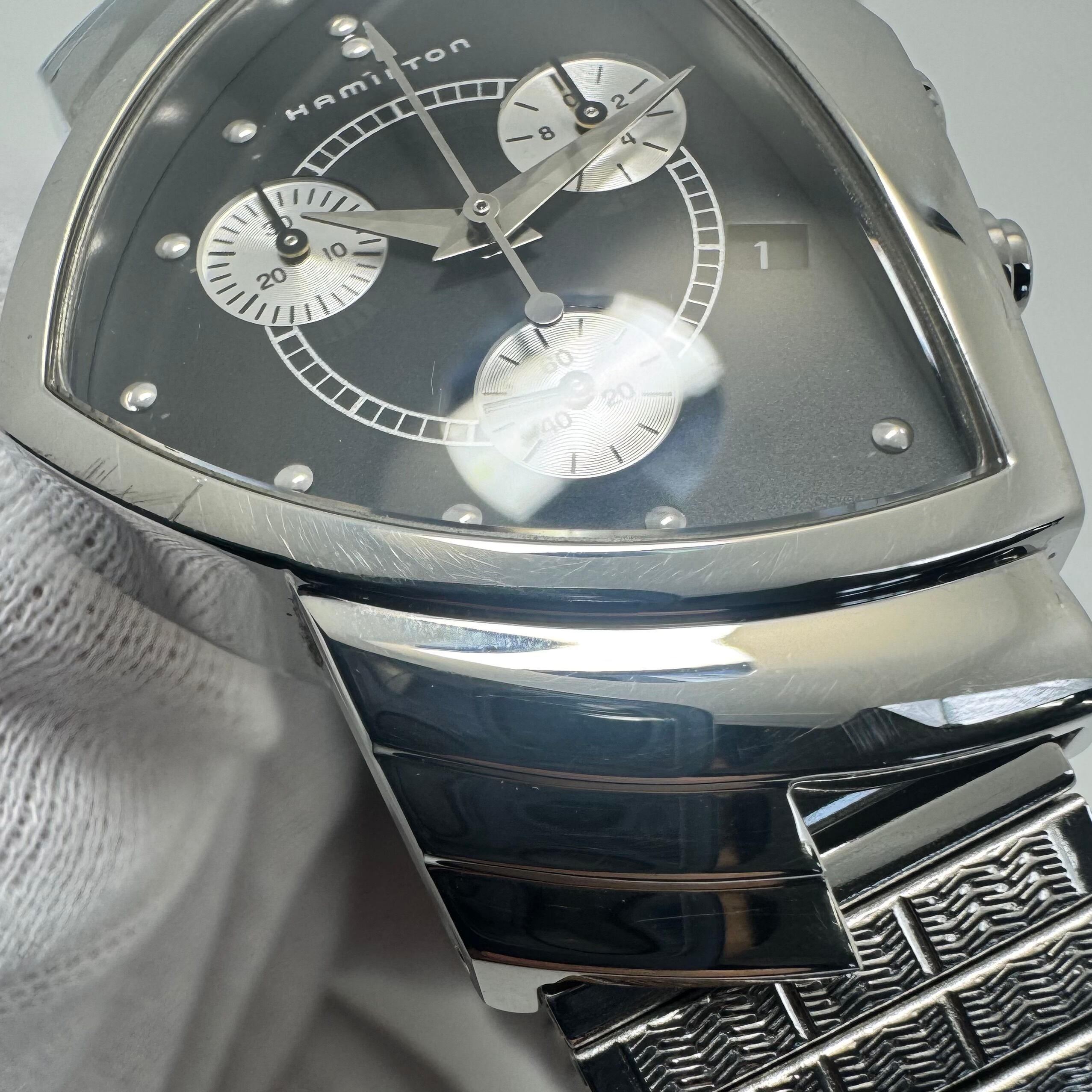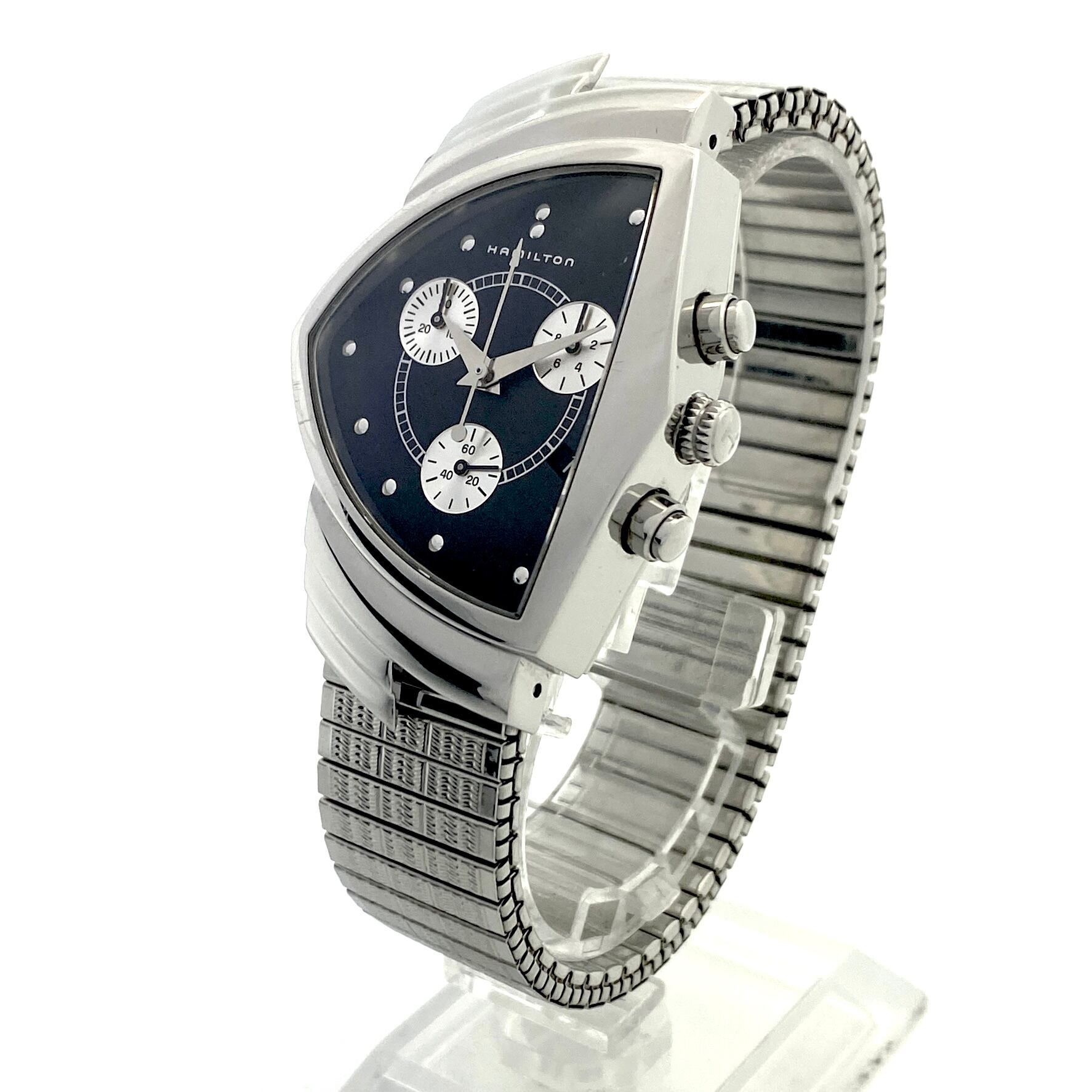 HAMILTON(ハミルトン)が誇るアイコンウォッチ「ベンチュラ」シリーズのクロノグラフクォーツモデル、 H244121です。