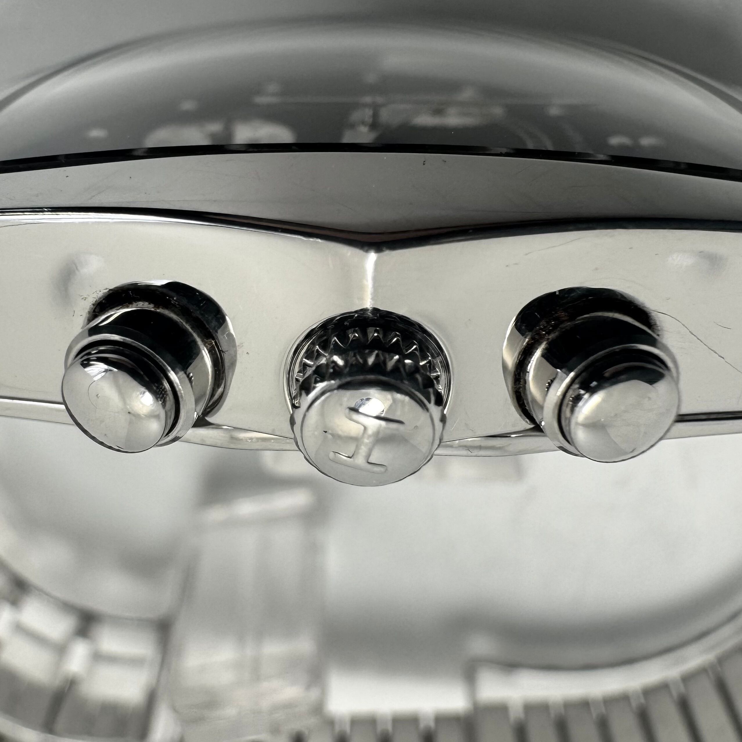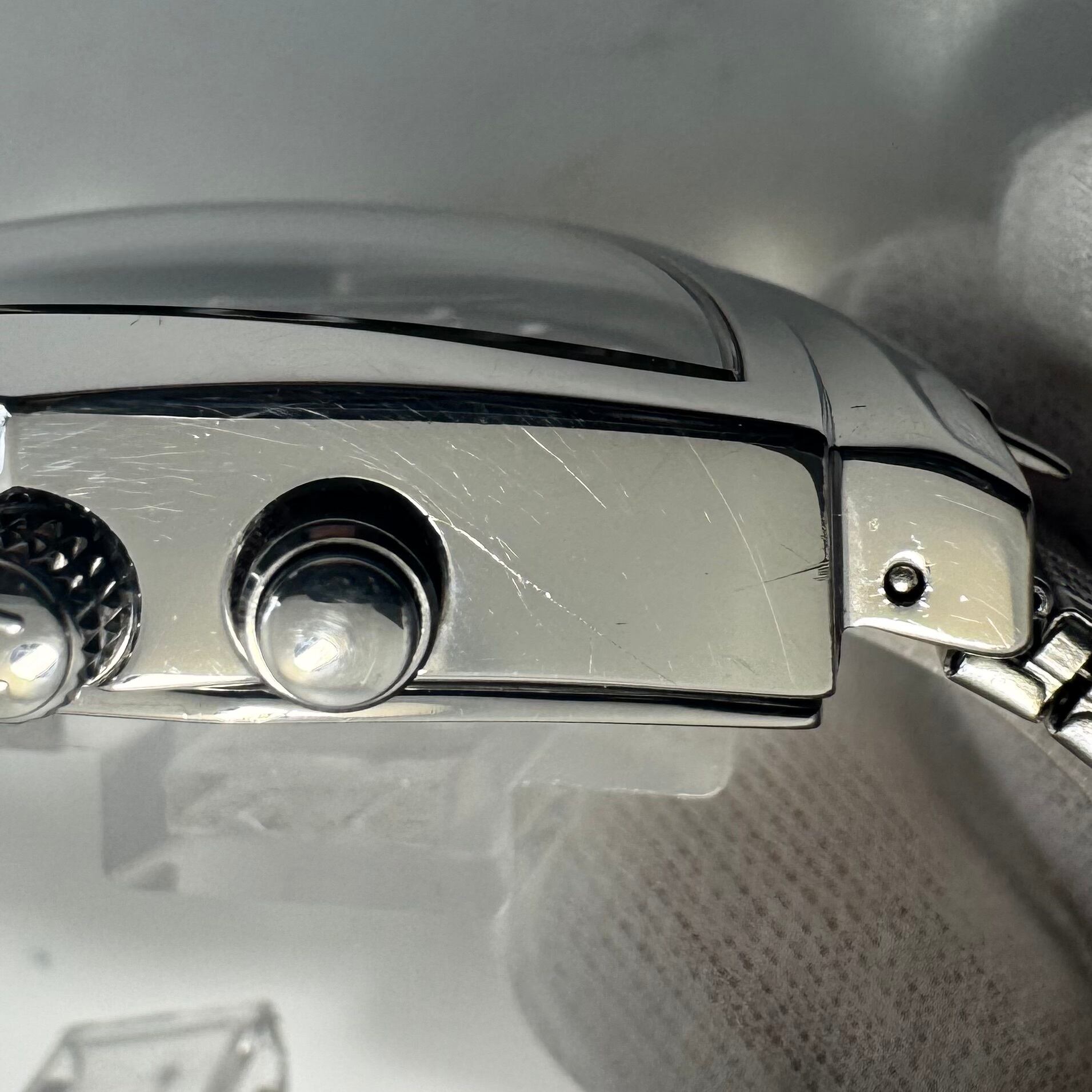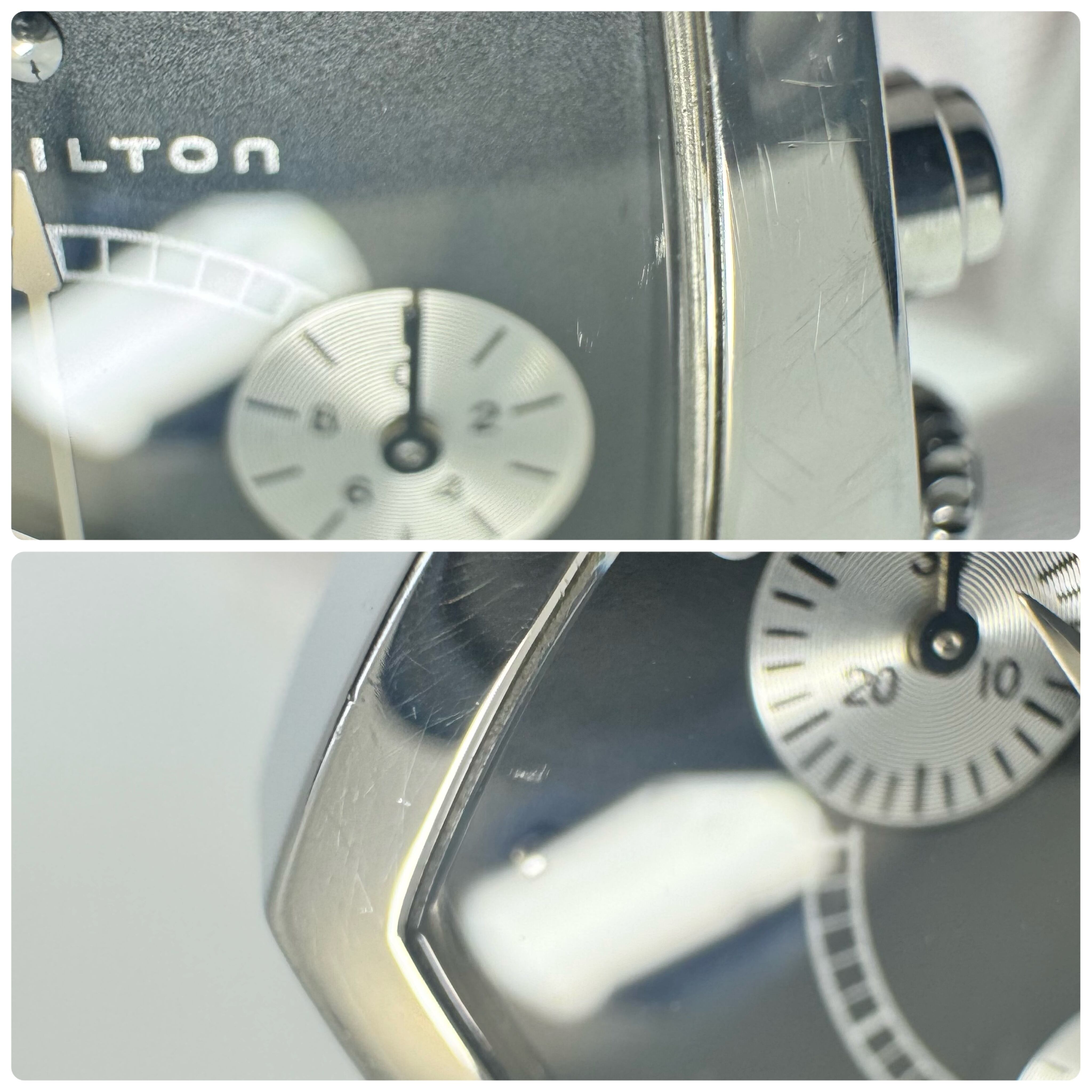 フェイス:ガラス面に極小のスレがありますが、肉眼では分からない程度です。ベゼル及びケース、裏蓋にスレや傷があります。