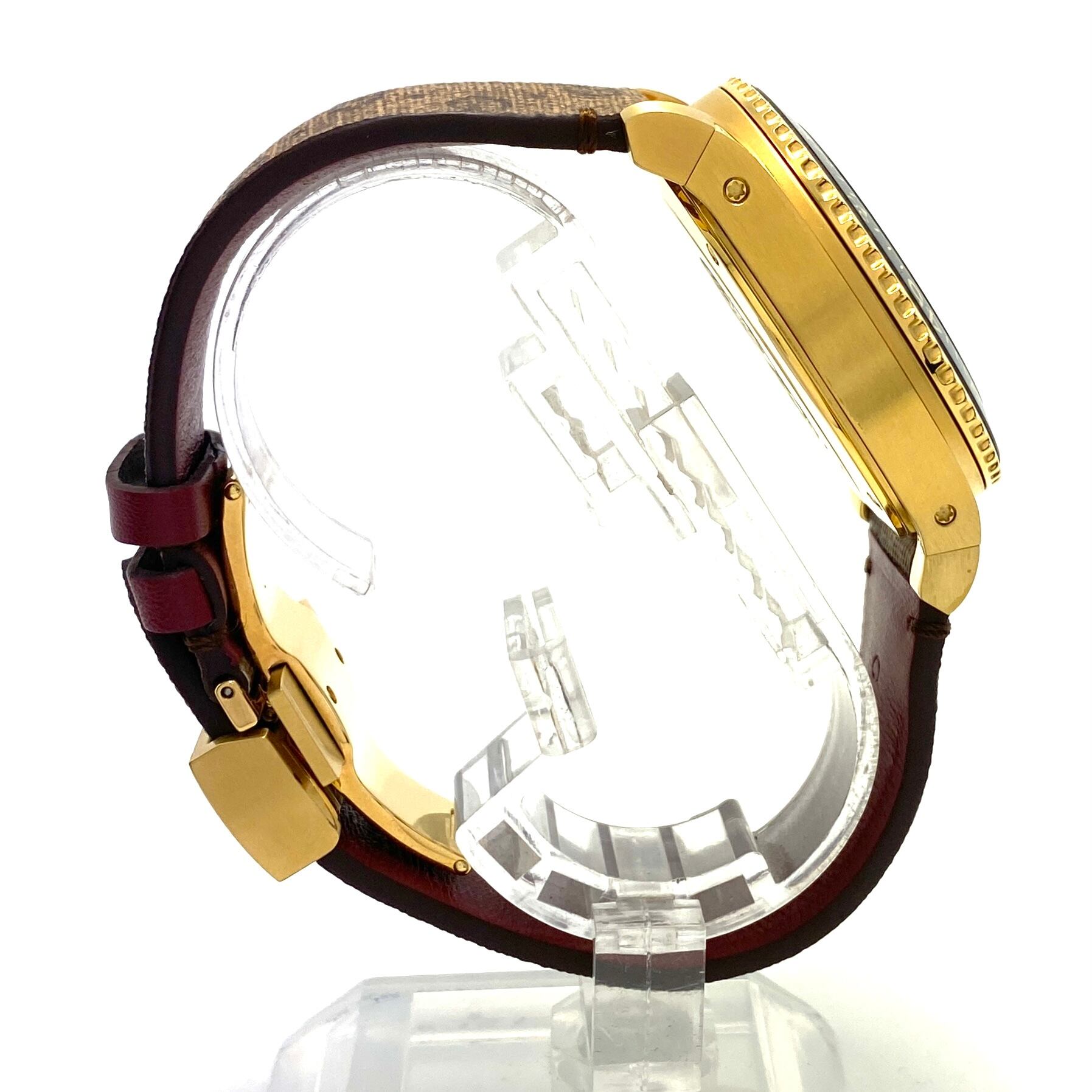 イエローゴールドGPケースとブラウンカラーの組み合わせは高級感と落ち着きを兼ね備え、革ベルト仕様により上品な印象も演出。ファッション性の高いスタイルに仕上げられています。