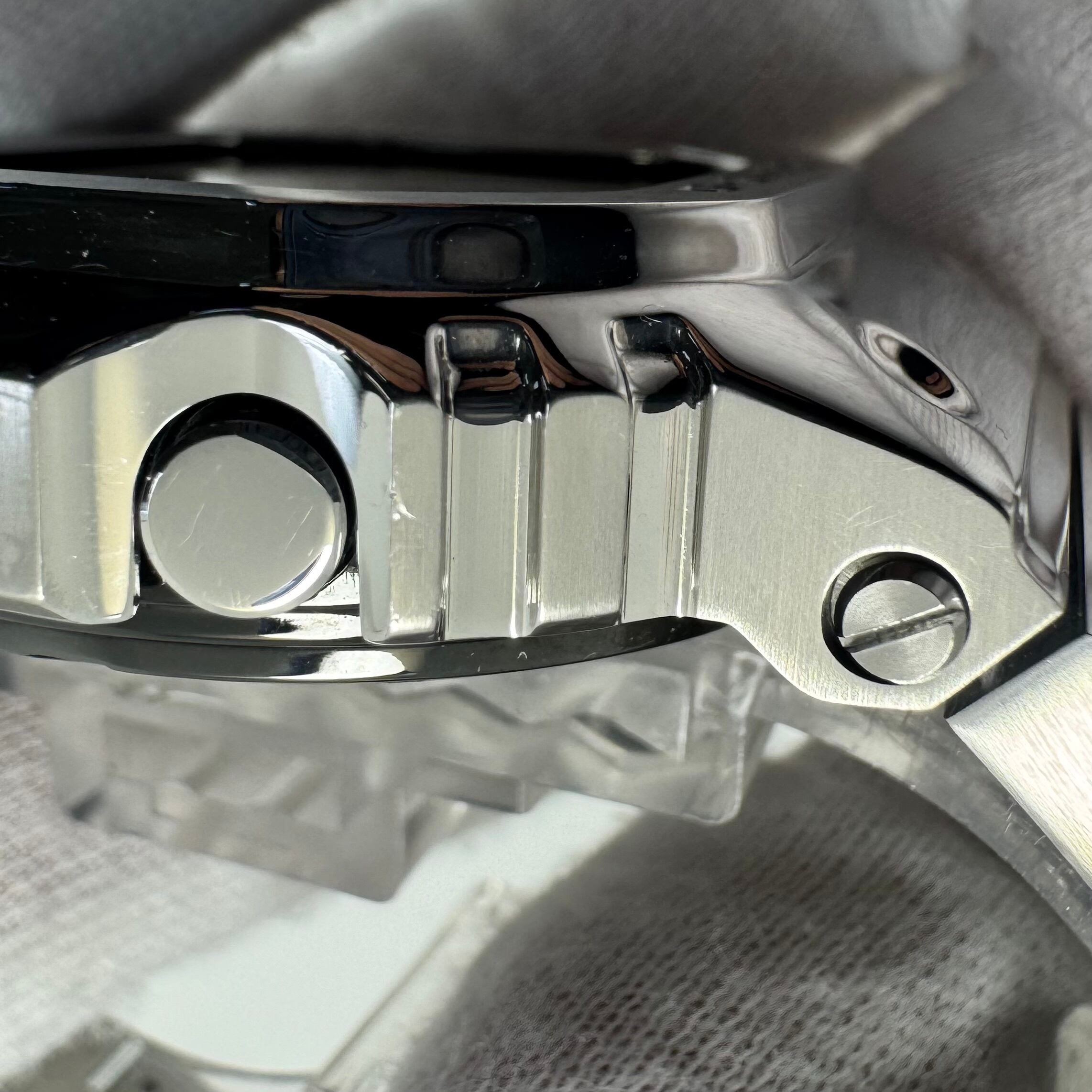 またベゼルやケースには繊細なヘアライン仕上げとポリッシュ加工が施され、見る角度によって異なる表情を見せる高級感あるデザインとなっています。