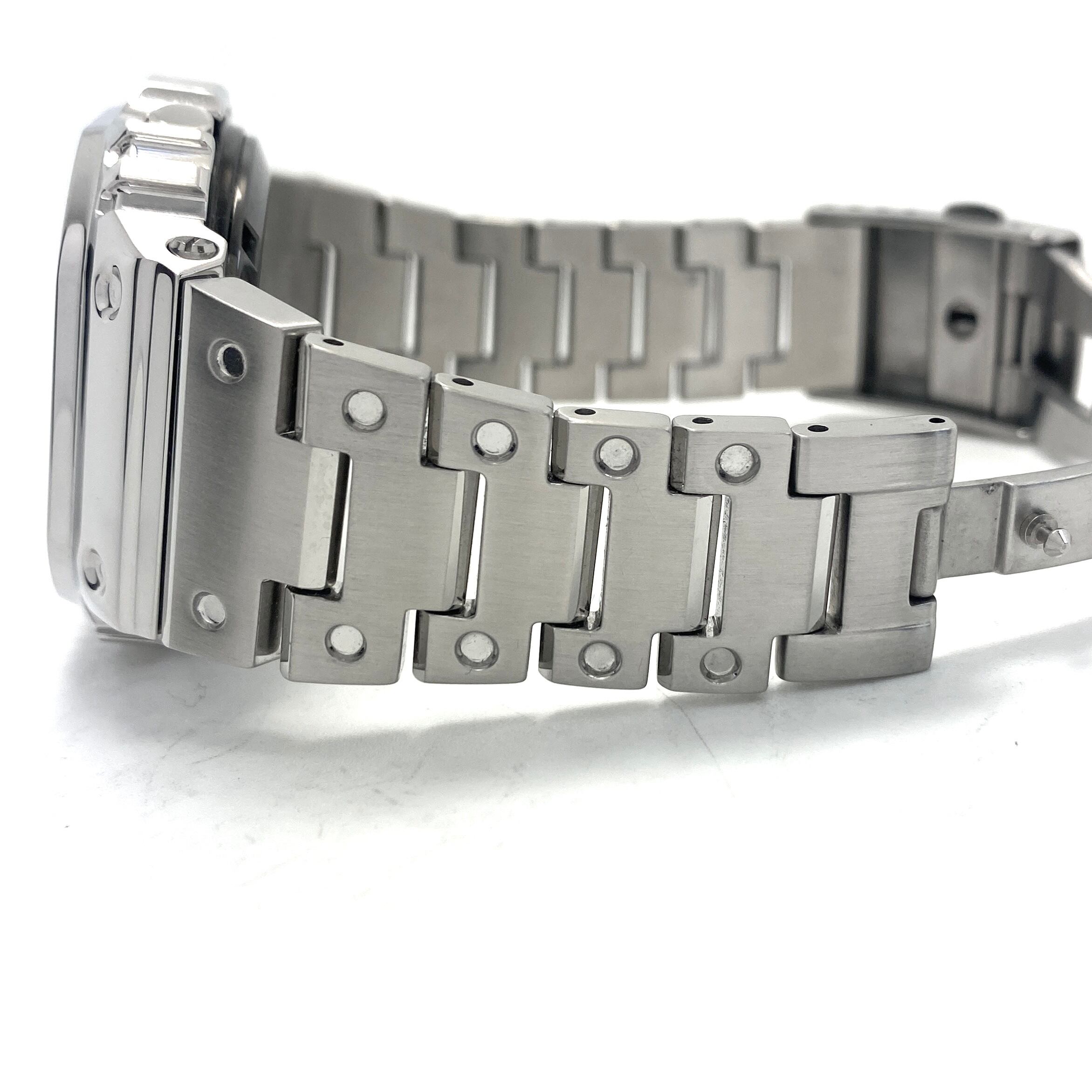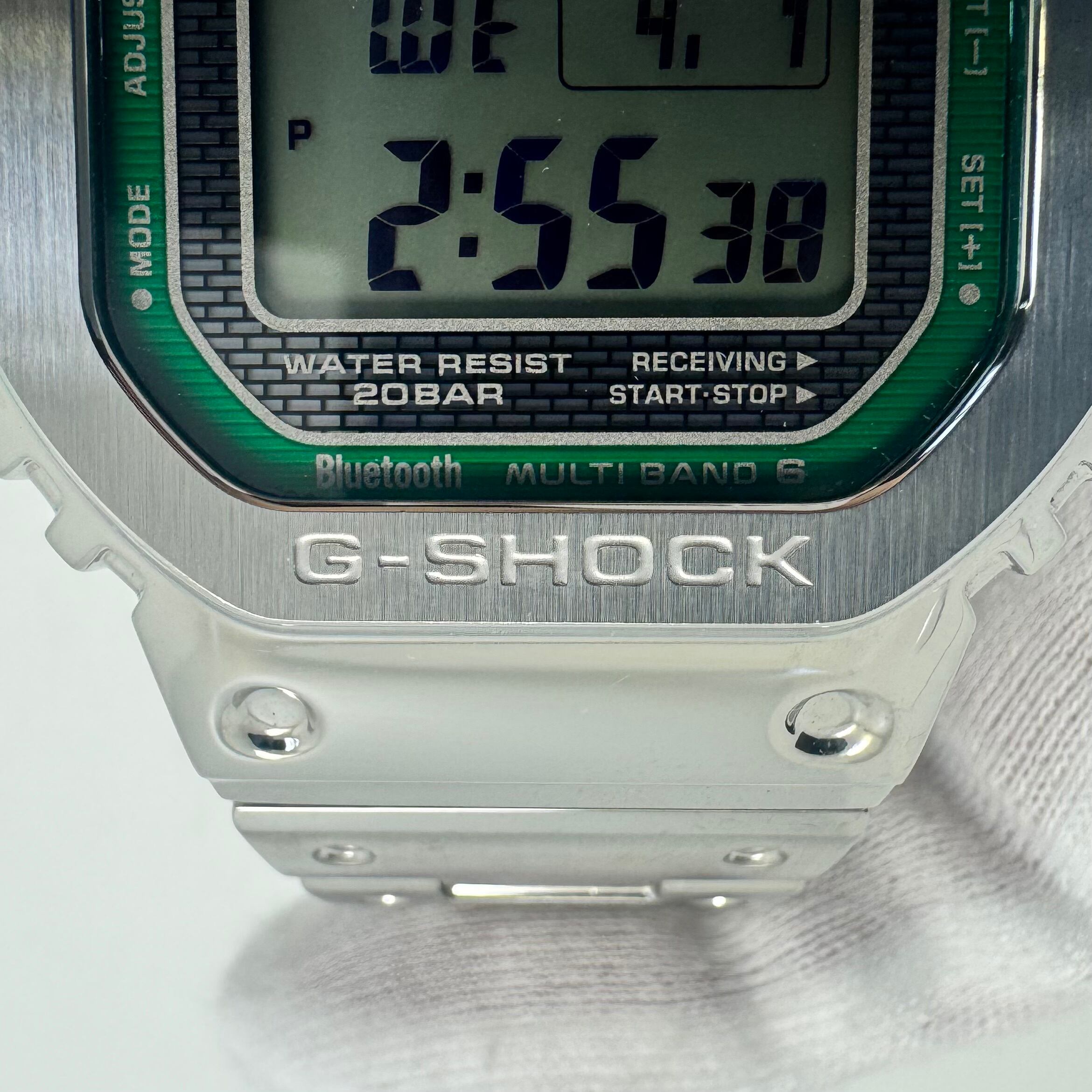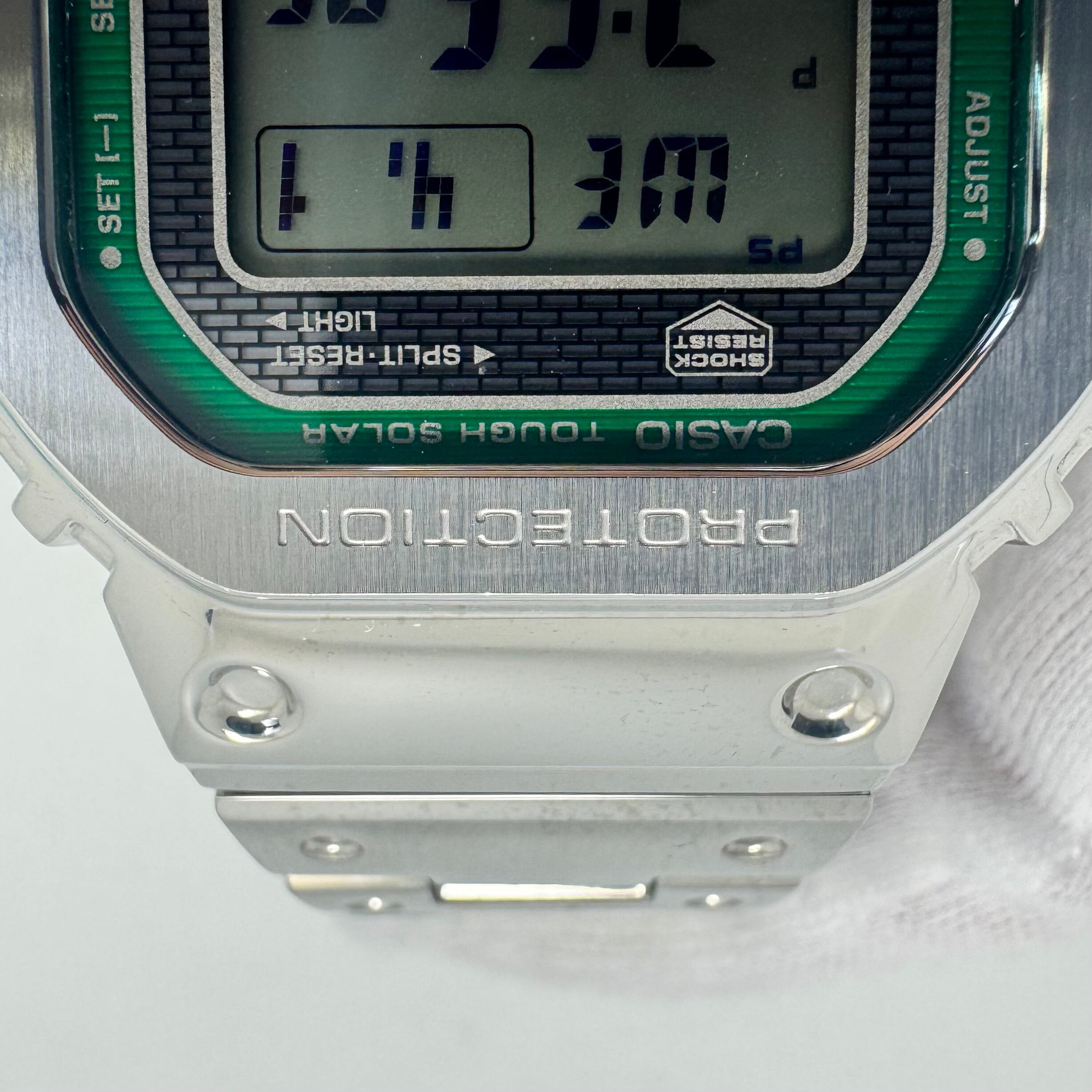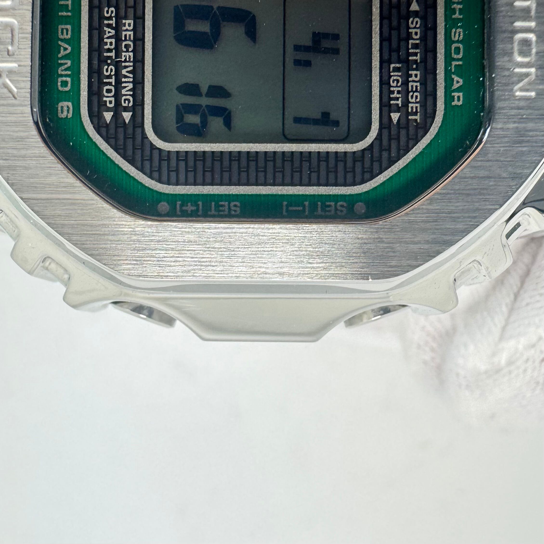 初代G-SHOCKのデザインを受け継ぐスクエアケースに、ステンレス素材を採用したフルメタルモデル。シルバーの質感にグリーンのアクセントが映える、シンプルながらも個性を感じさせる一本です。