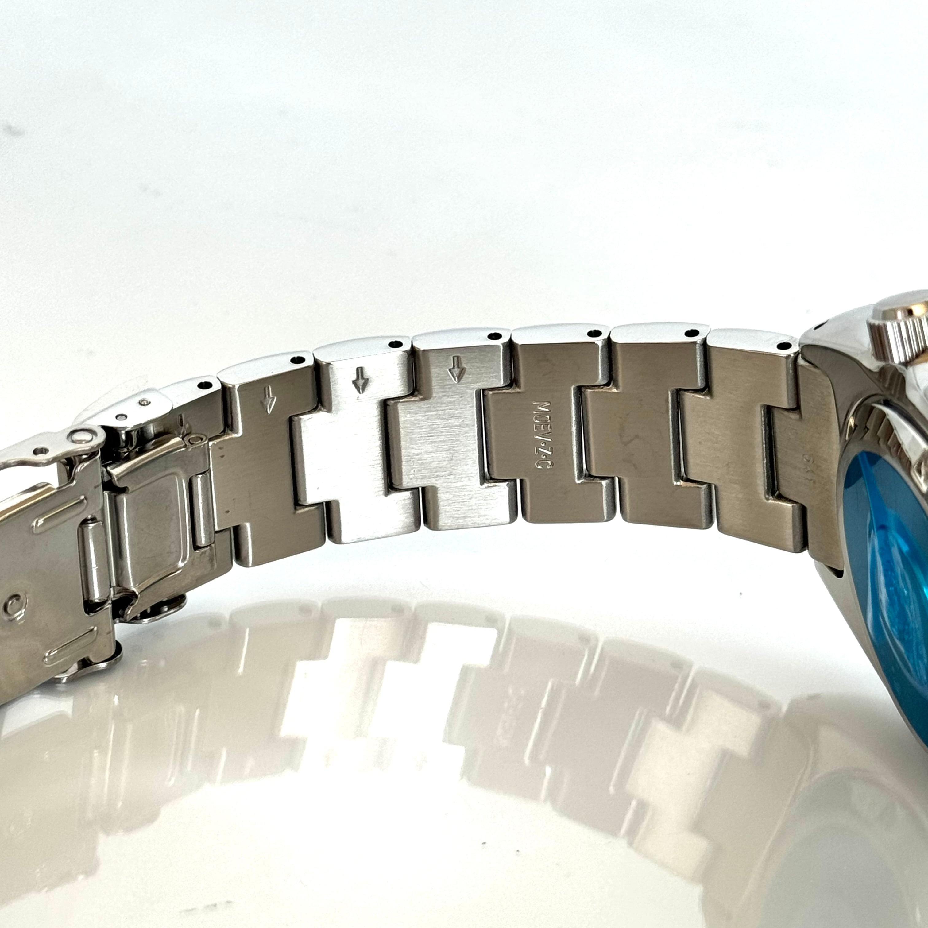 自動巻き式で、文字盤の鮮やかなブルーが目を惹くお洒落な品です。