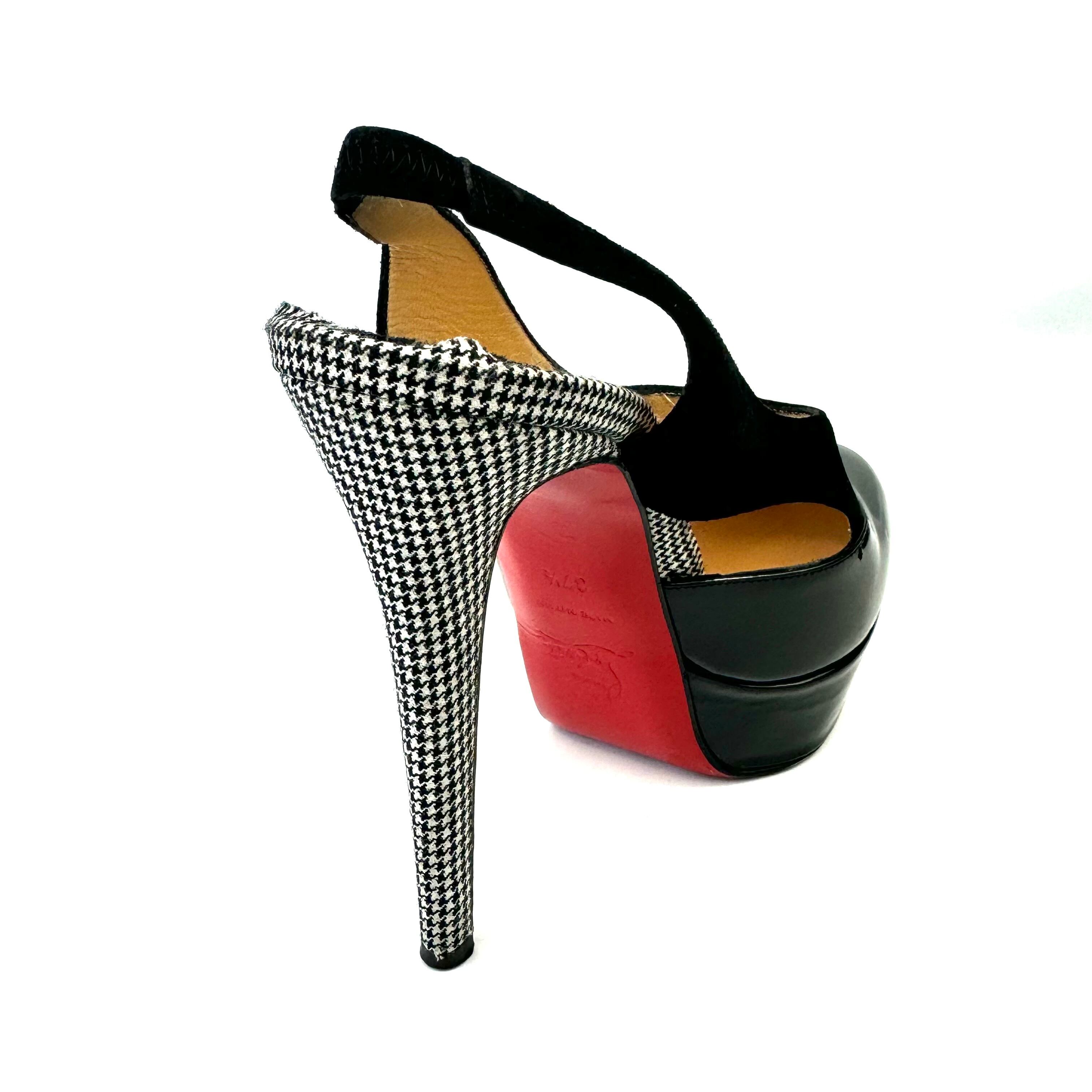 ブラックカラーにアウトソールが赤色のルブタン定番の色合いです。またヒール部分に千鳥格子がデザインされていてとても印象的です。